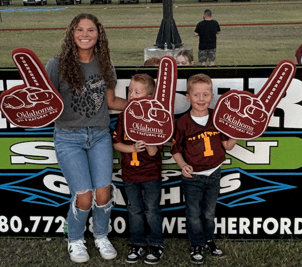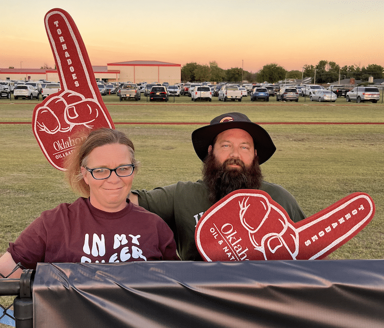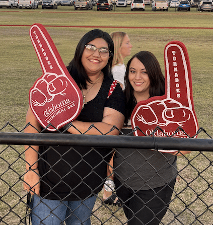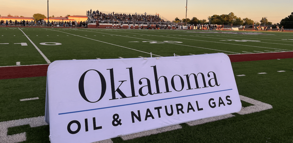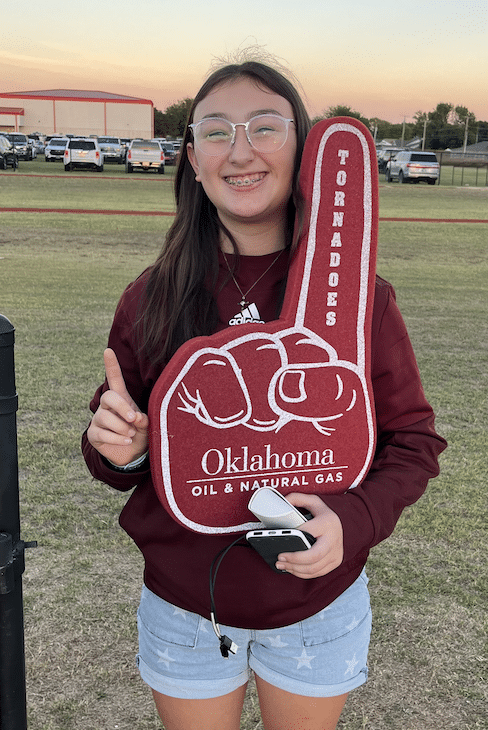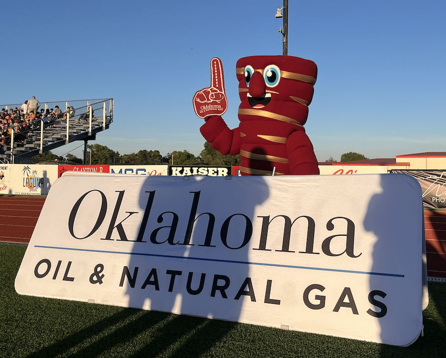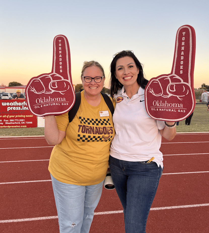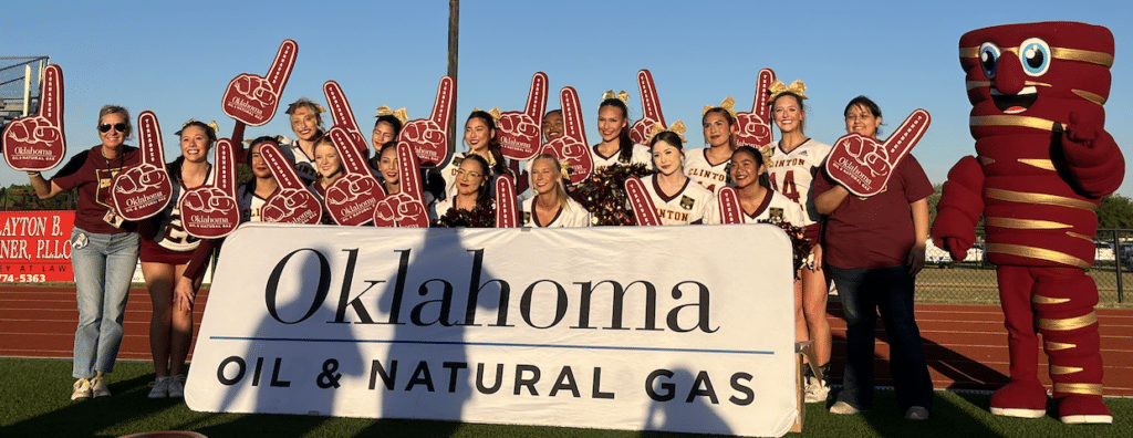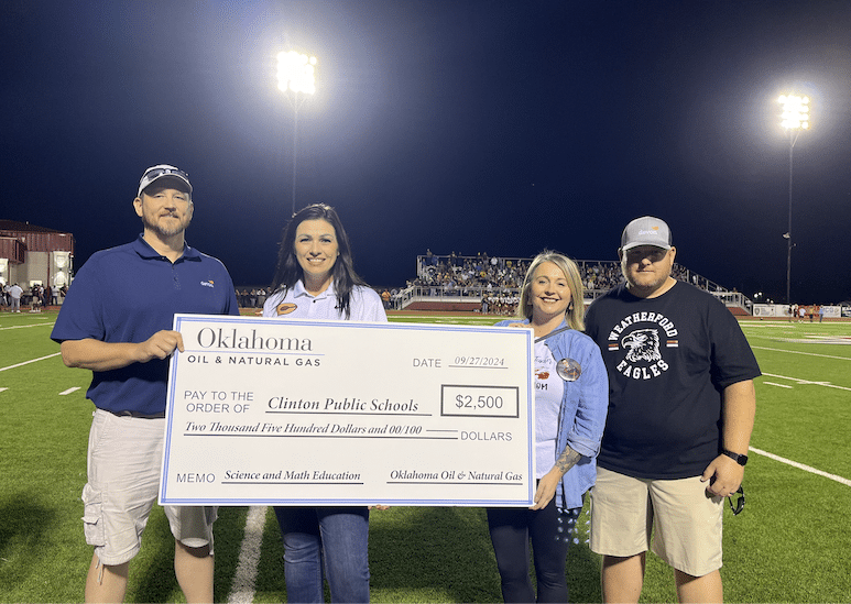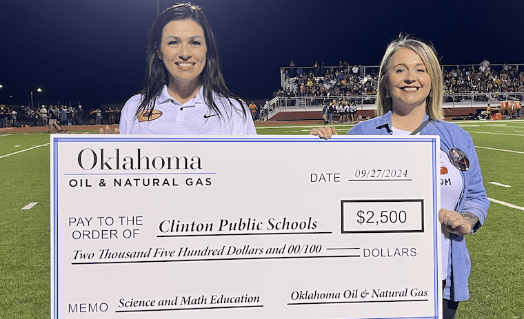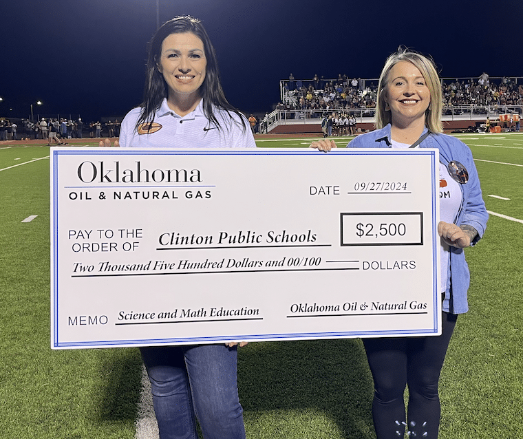 At the Clinton at Weatherford football game, Clinton Principal Michelle Sorter and teacher Cindy Bond were presented a check for Science and Math education for Clinton High School by the people of Oklahoma Oil & Natural Gas. Devon Energy’s Wally Stillwell and Michael Webb were also in attendance for the presentation.